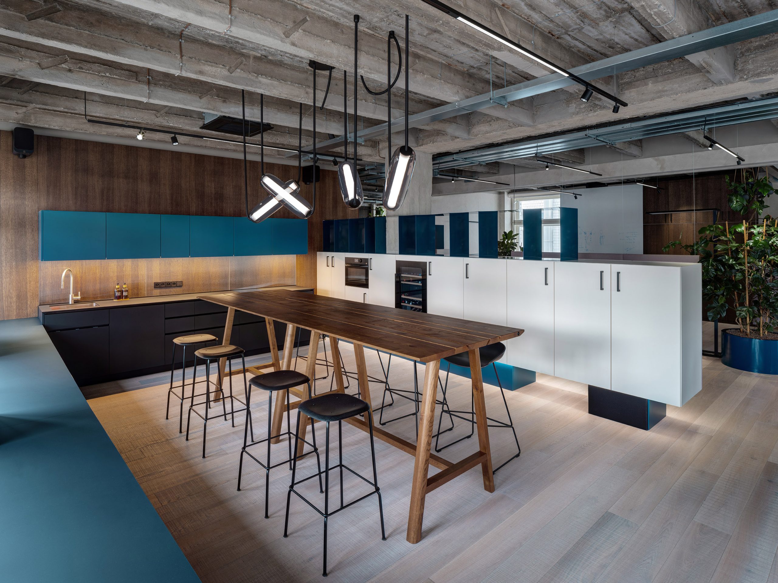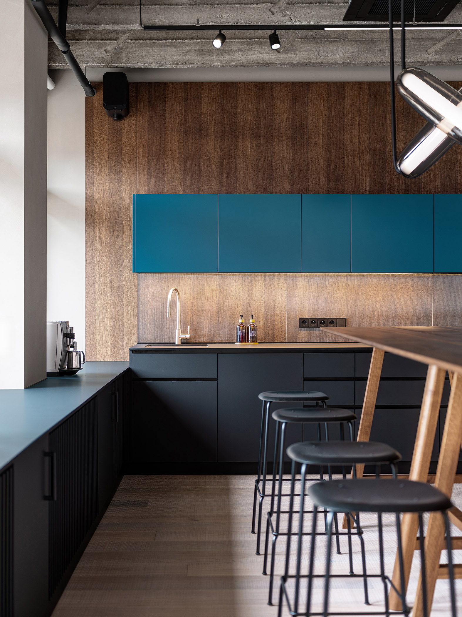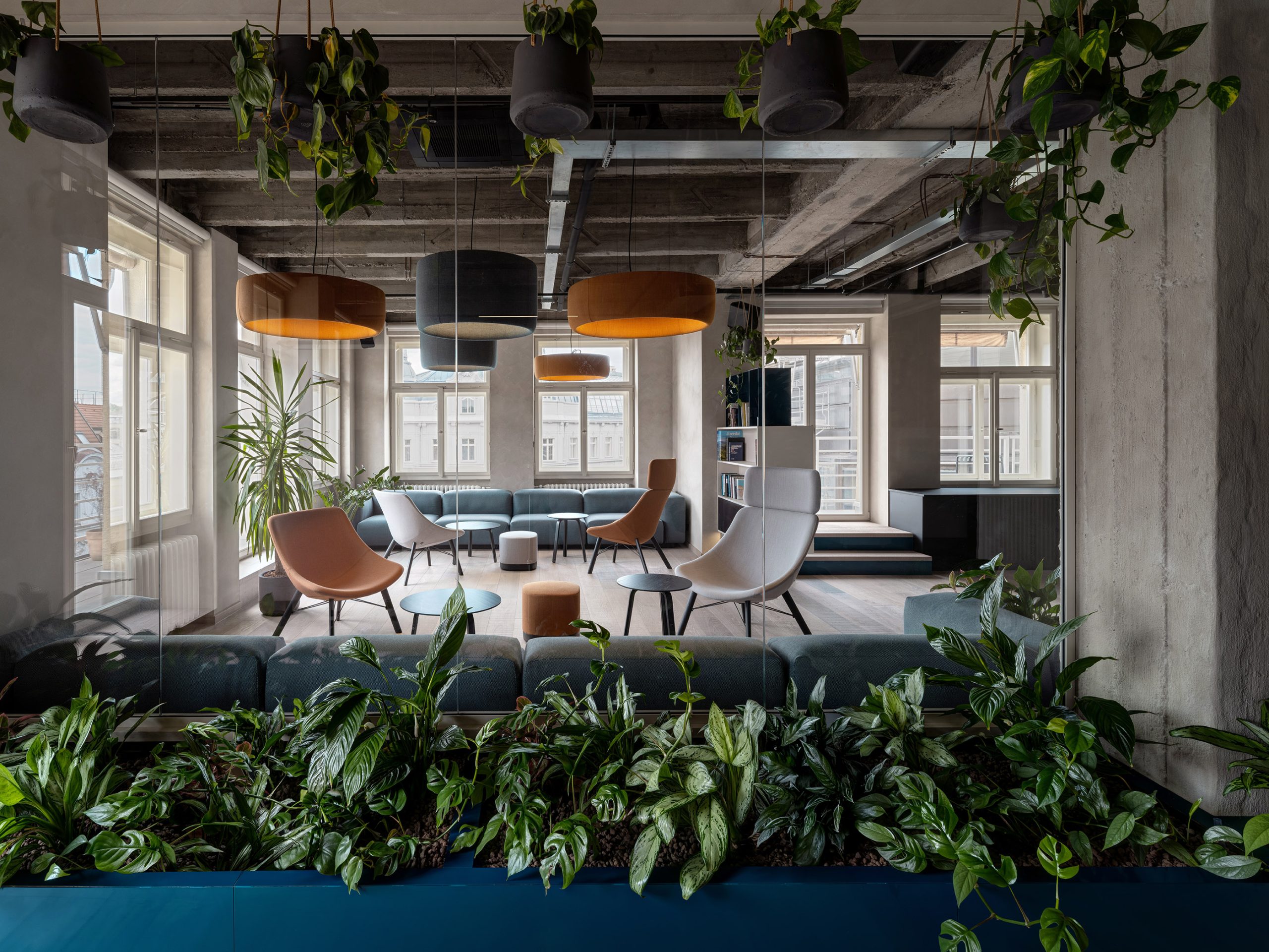A new interior has been created in the center of Prague, offering harmony, rawness and a Zen atmosphere all in one. The raw reinforced concrete skeleton has been transformed into a sophisticated and timeless working environment. The area of ​​445 m² includes two closed offices, meeting rooms, open space, a dining room and relaxation areas.