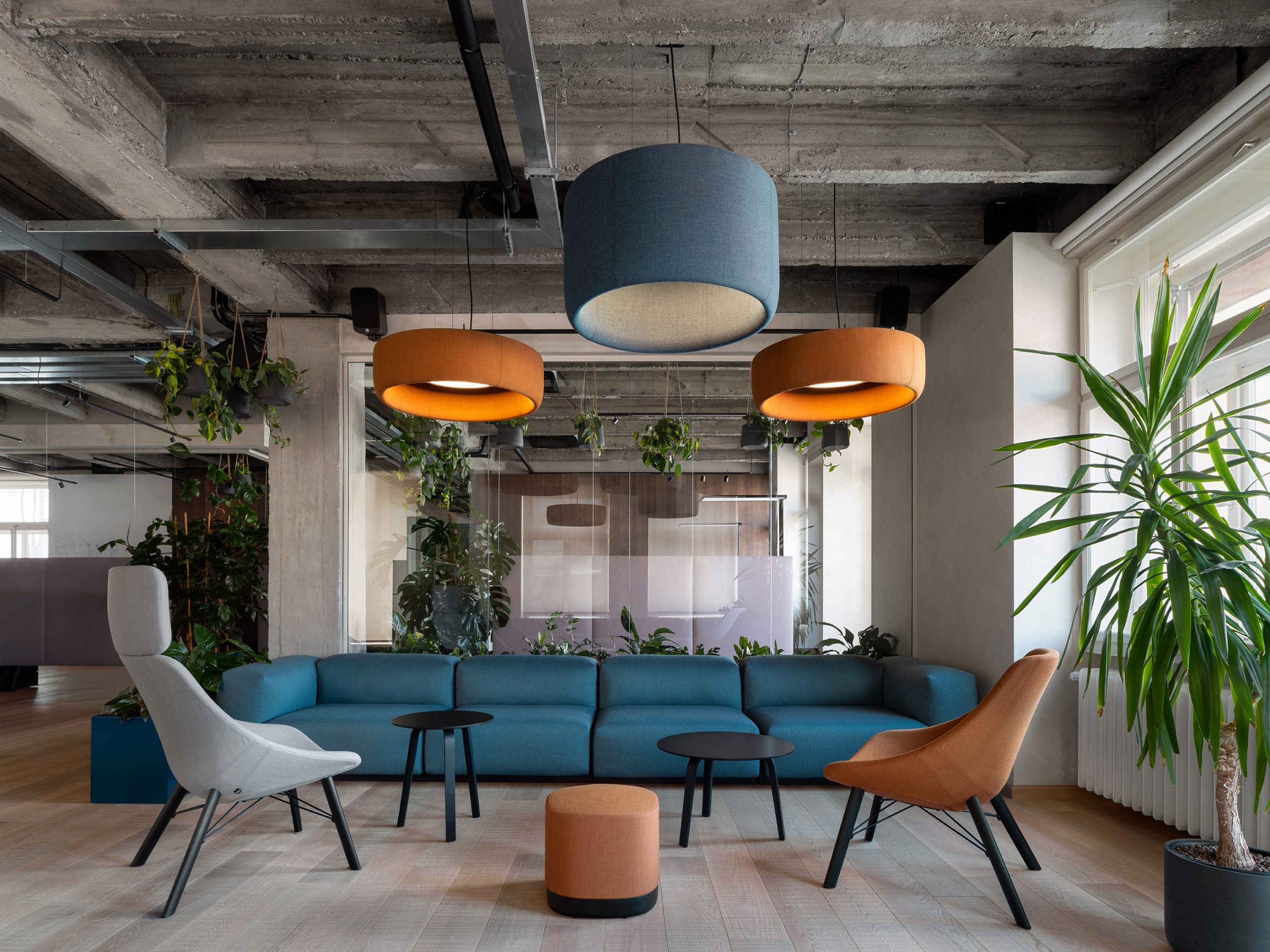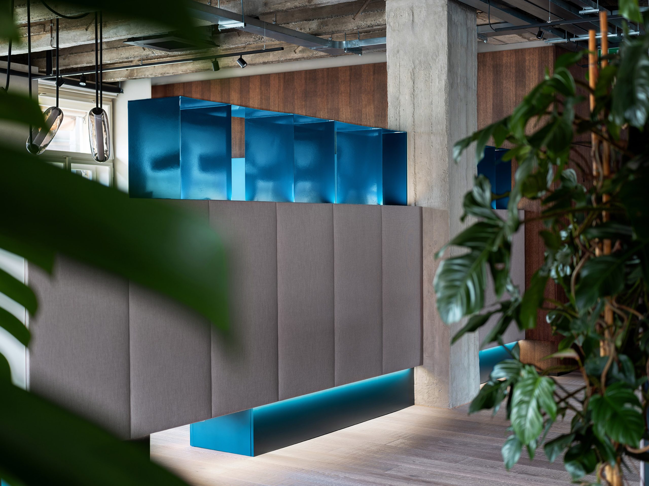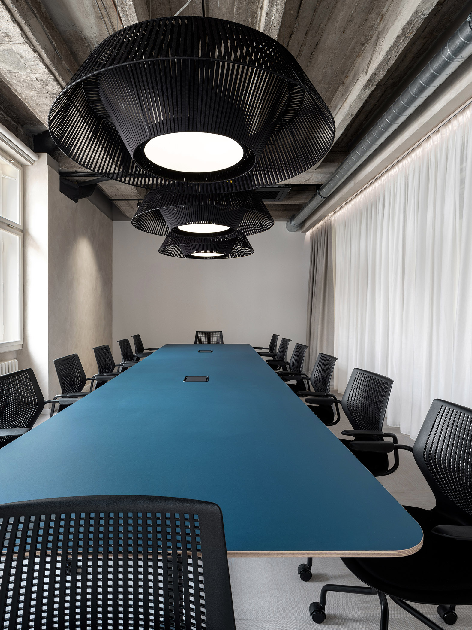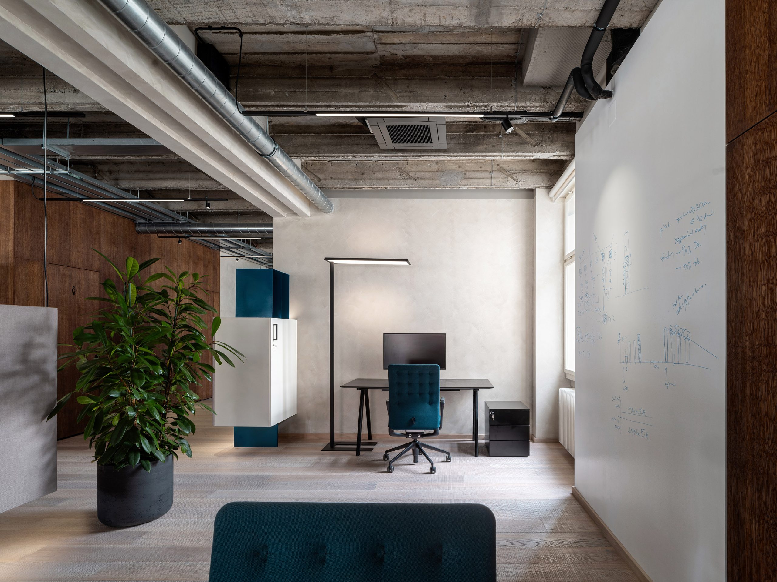 The main element has become the exposed concrete ceiling, originally considered a disadvantage. Today it determines the character of the interior and has become an inspiration for other offices in the building. The brutalist roughness contrasts with the delicate materiality of wood, textiles and muted colors. The material palette is based on nature: smoked oak on the floors, walnut veneer furniture, textiles in linen and woven designs.