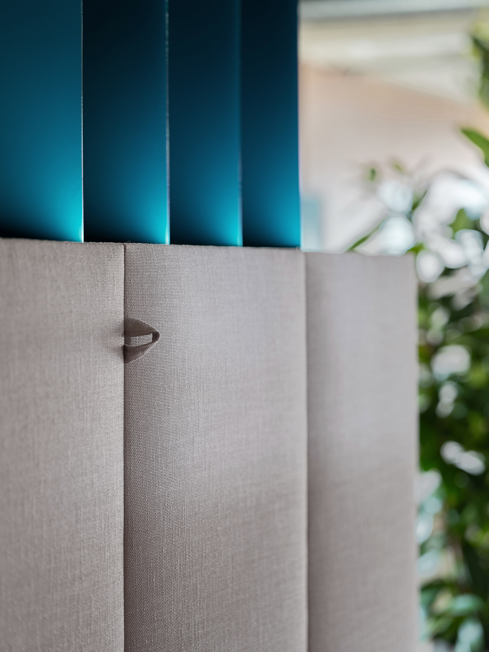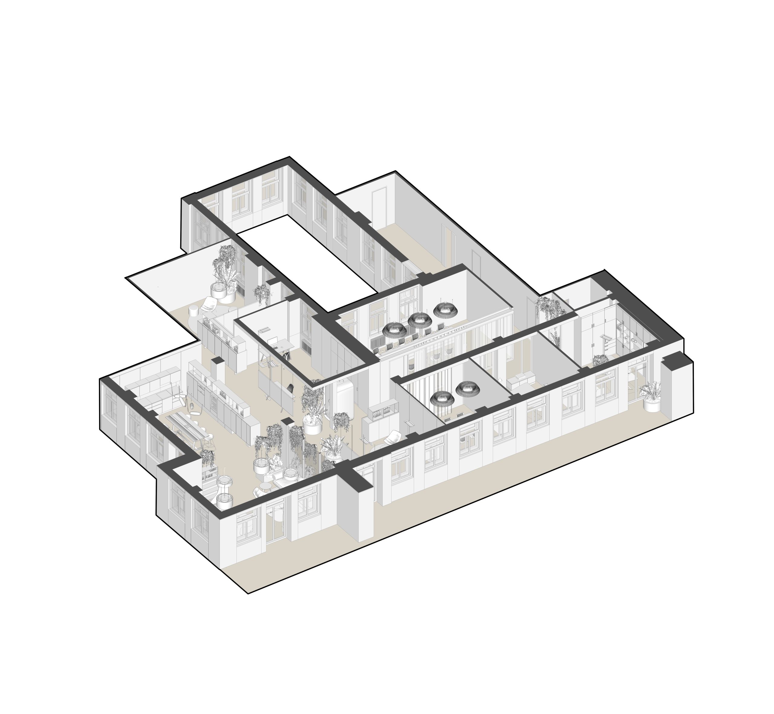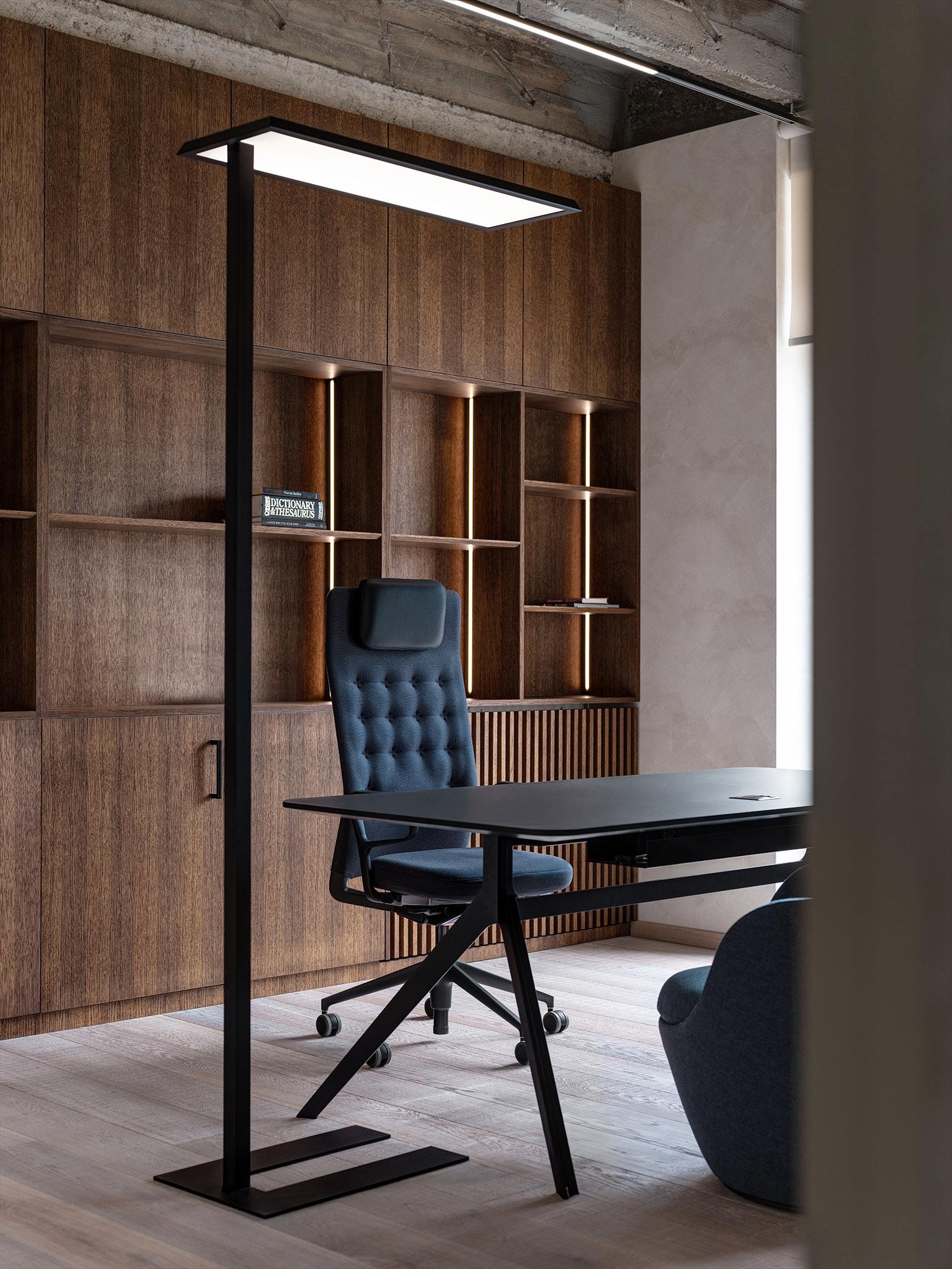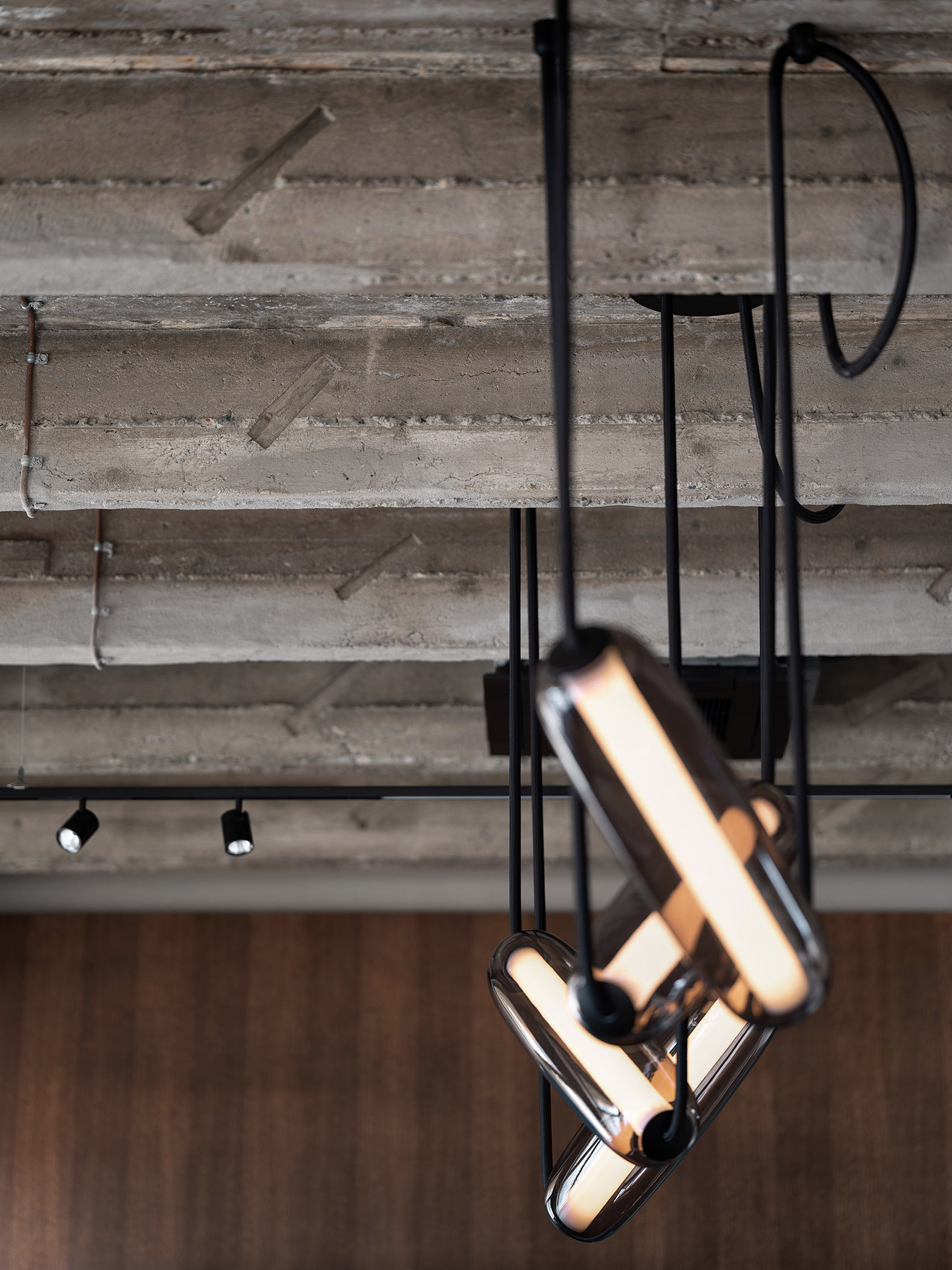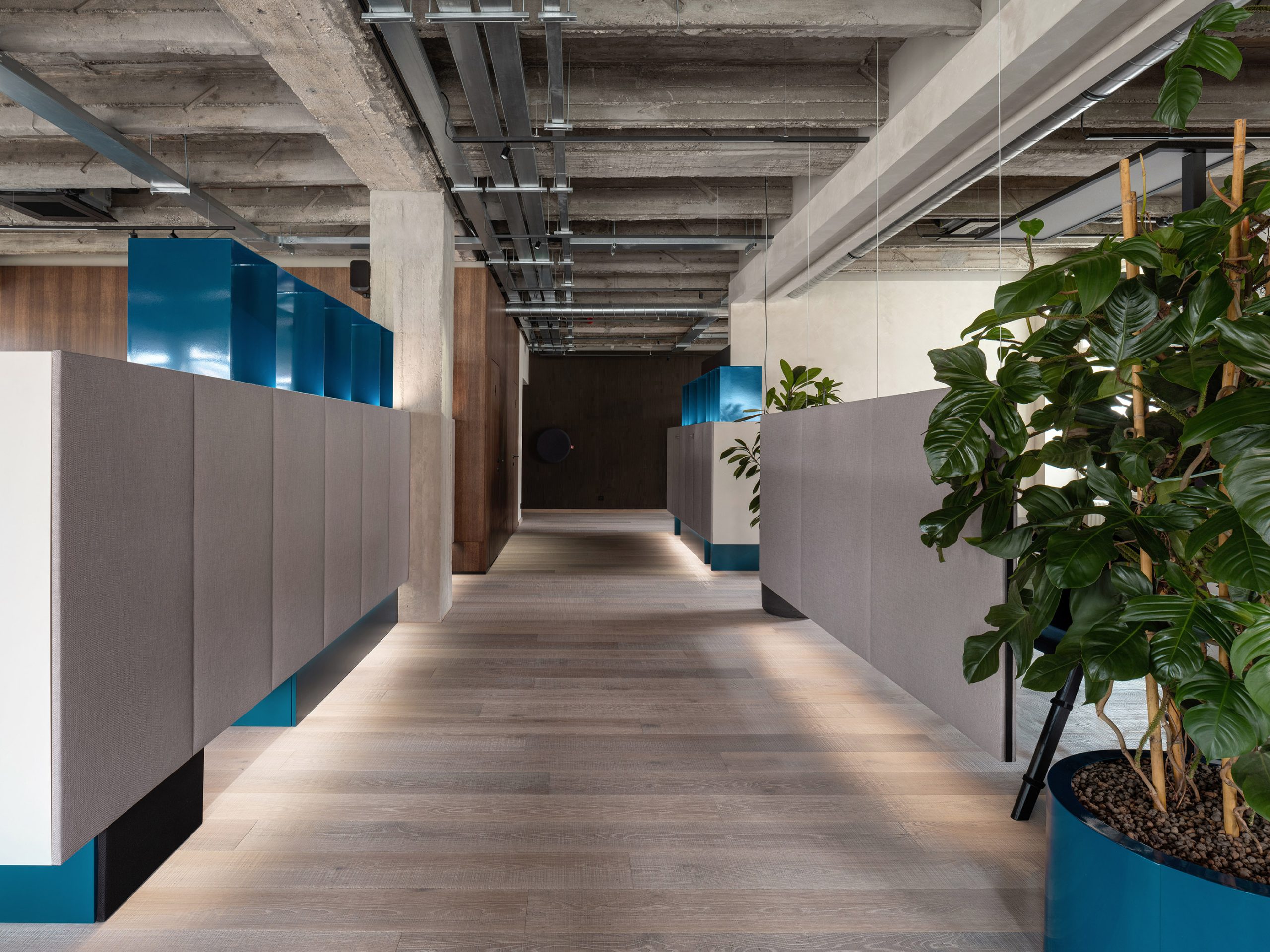 The main element has become the exposed concrete ceiling, originally considered a disadvantage. Today it determines the character of the interior and has become an inspiration for other offices in the building. The brutalist roughness contrasts with the delicate materiality of wood, textiles and muted colors. The material palette is based on nature: smoked oak on the floors, walnut veneer furniture, textiles in linen and woven designs.